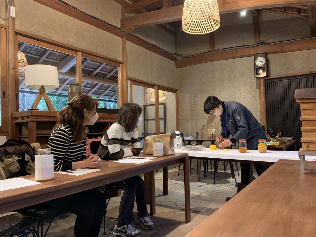 今回のはちみつ教室は、柚子狩りを楽しんで頂いた後、柚子のはちみつ漬け+はちみつとミツバチの講座でした。