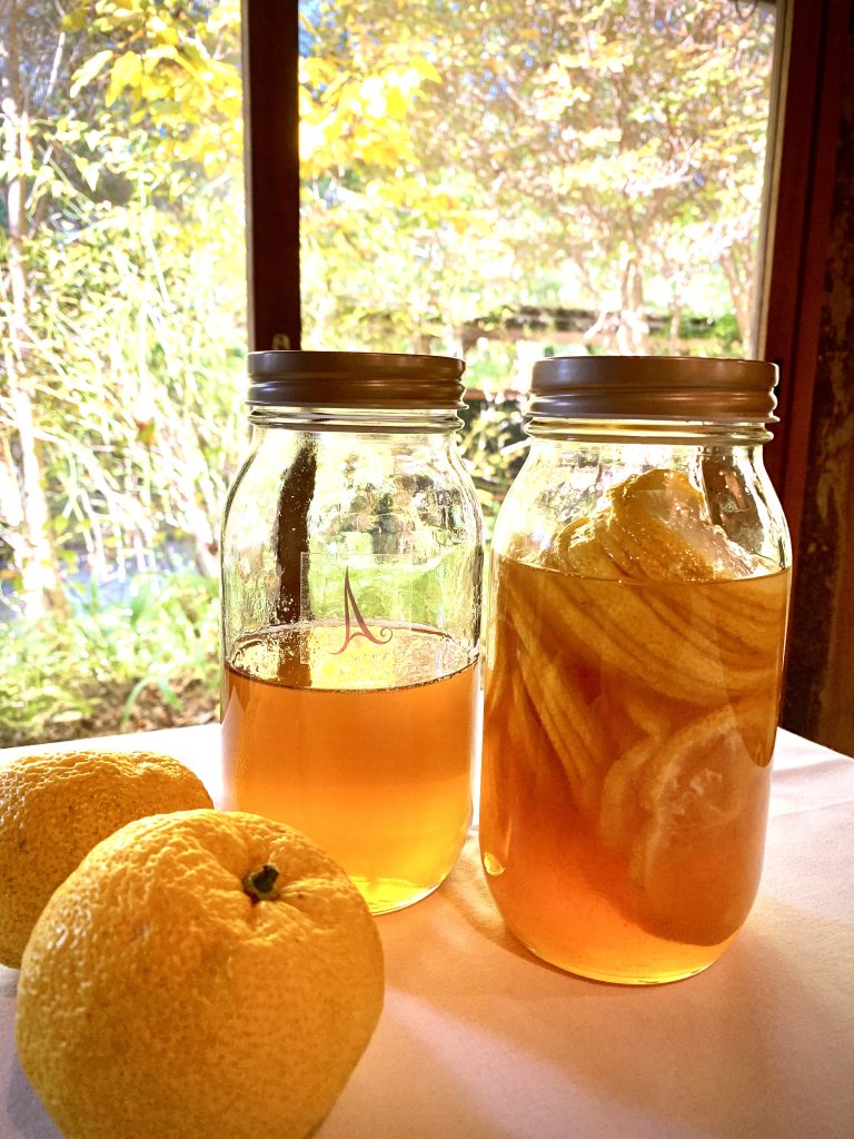 実演に入ると、教室中が柚子の香りに包まれました。木頭柚子と言う料亭でも使用されている品種なので、上品な香りです。はちみつに漬けても香りが残ります。
